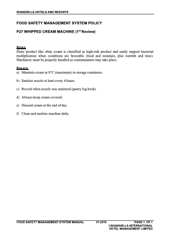 FOOD SAFETY MANAGEMENT SYSTEM POLICY P27 WHIPPED CREAM MACHINE (1st Review)