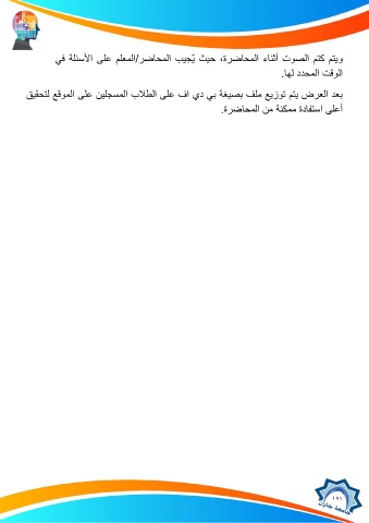 وَتم كتم الصوت أثناء المحاضرة ،حَث ٌَجَب المحاضر/المعلم علً الأسئلة فٍ الولت المحدد لها. بعد العرض َتم توزَع ملؾ بصَؽة بٍ دٌ اؾ علً الطلاب المسجلَن علً المولع لتحمَك أعلً استفادة ممكنة من المحاضرة. 191