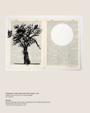 Drawing for Sibyl (Tree and Circle, Blue), 2019 Indian ink and acrylic on found pages 27 x 38 cm $9 000 (Each drawing comes with a Waiting for the Sibyl publication) Quoted prices are exclusive of taxes, custom duties and shipping costss