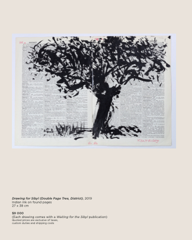 Drawing for Sibyl (Double Page Tree, District), 2019 Indian ink on found pages 27 x 38 cm $9 000 (Each drawing comes with a Waiting for the Sibyl publication) Quoted prices are exclusive of taxes, custom duties and shipping costs