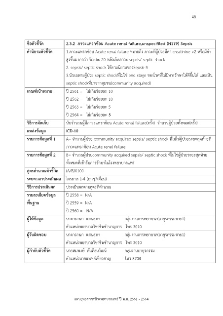 ชื่อตัวชี้วัด 2.3.2 ภาวะแทรกซ้อน Acute renal failure,unspecifiled (N179) Sepsis