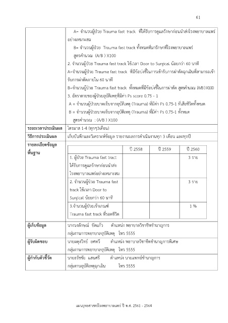 B=จ านวนผู้ป่วย Trauma fast track  ทั้งหมดที่มีข้อบ่งชี้ในการผ่าตัด สูตรค านวณ  (A/B ) X100