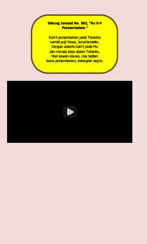 Kidung Jemaat No. 302, “Ku b’ri Persembahan.” Kub‟ri persembahan pada Tuhanku sambil puji Yesus, Jurus‟lamatku. Dengan sukaria kub‟ri pada-Mu dan merasa kaya dalam Tuhanku. Mari kawan-kawan, rela hatilah bawa persembahan; datanglah seg‟ra.