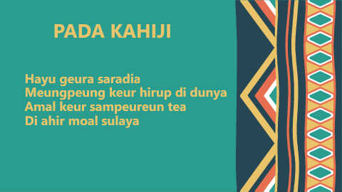 PADA KAHIJI Hayu geura saradia Meungpeung keur hirup di dunya Amal keur sampeureun tea Di ahir moal sulaya