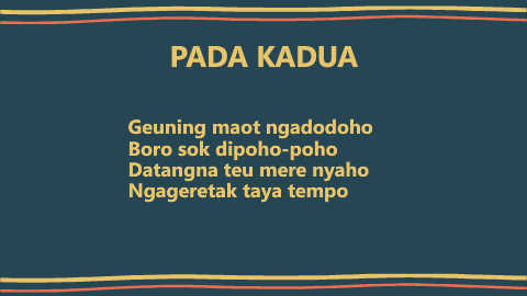 PADA KADUA Geuning maot ngadodoho Boro sok dipoho-poho Datangna teu mere nyaho Ngageretak taya tempo