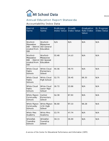 School Name Wexford- Missaukee ISD General Education Wexford- Missaukee ISD Special Education White Cloud Elementary School White Cloud High School White Cloud Junior High School Central Elementary School White Pigeon Jr/Sr High School White Pine Academy Whitefish Township School