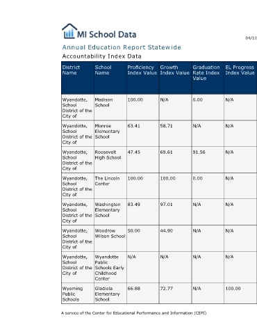 Proficiency Index Value 100.00 63.41 47.45 100.00 83.49 50.00 N/A 66.88 A service of the Center for Educational Performance and Information (CEPI)