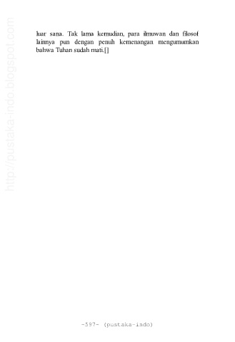 http://pustaka-indo.blogspot.com luar sana. Tak lama kemudian, para ilmuwan dan filosof lainnya pun dengan penuh kemenangan mengumumkan bahwa Tuhan sudah mati.[] ~597~ (pustaka-indo)