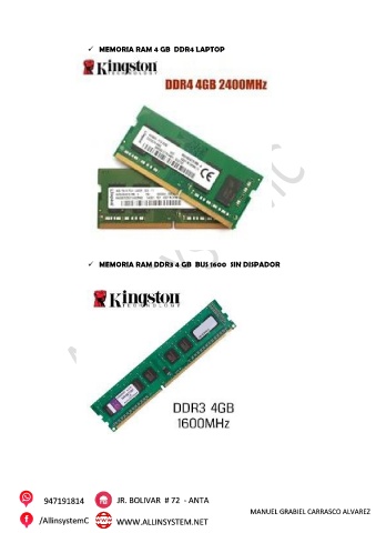 ✓ MEMORIA RAM 4 GB DDR4 LAPTOP ✓ MEMORIA RAM DDR3 4 GB BUS 1600 SIN DISPADOR 947191814 JR. BOLIVAR # 72 - ANTA MANUEL GRABIEL CARRASCO ALVAREZ /AllinsystemC WWW.ALLINSYSTEM.NET