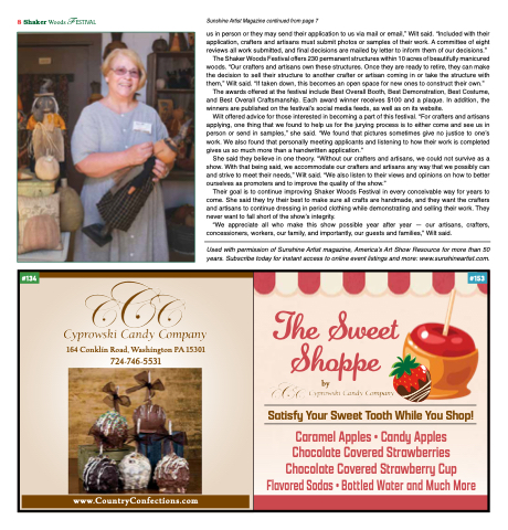 She said they believe in one theory. “Without our crafters and artisans, we could not survive as a show. With that being said, we accommodate our crafters and artisans any way that we possibly can and strive to meet their needs,” Wilt said. “We also listen to their views and opinions on how to better ourselves as promoters and to improve the quality of the show.”