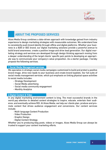 Alces Media Group combines a data-driven approach with knowledge gained from industry experience to design marketing strategies with measurable outcomes. We understand how to consistently push brand identity through offline and digital platforms. Whether your busi- ness is a B2B or B2C brand, our digital marketing solutions provide a powerful avenue to build brand awareness, create a positive image and drive lead generation. Our digital mar- keting strategy and services are developed through design thinking approach moving from a deeper understanding of the target clients’ specific pain points to developing an appropri- ate way to communicate your company’s value proposition. As a starter package, I hereby propose the following services.