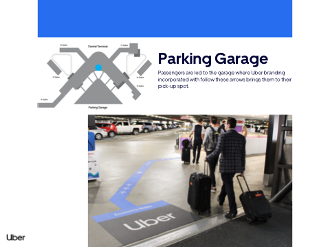 Parking Garage Passengers are led to the garage where Uber branding incorporated with follow these arrows brings them to their pick-up spot.
