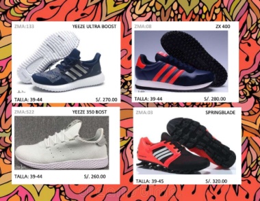 YEEZE ULTRA BOOST ZX 400 TALLA: 39-44 S/. 270.00 TALLA: 39-44 S/. 280.00 YEEZE 350 BOST SPRINGBLADE TALLA: 39-44 S/. 260.00 TALLA: 39-45 S/. 320.00