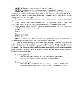 GROUP BY бӛлімінде есептер ӛрістерінің тізімі беріледі.