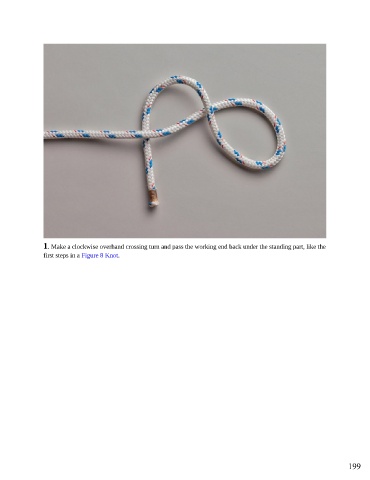 1. Make a clockwise overhand crossing turn and pass the working end back under the standing part, like the first steps in a Figure 8 Knot. 199
