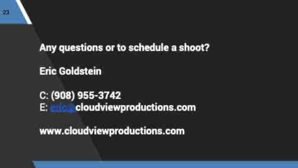 23 Any questions or to schedule a shoot? Eric Goldstein C: (908) 955-3742 E: eric@cloudviewproductions.com www.cloudviewproductions.com