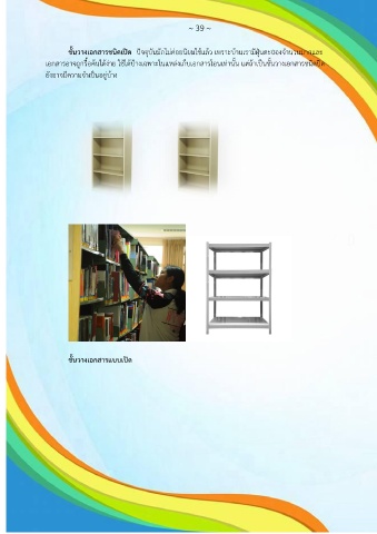 ~ 39 ~ ชั้นวางเอกสารชนิดเปิด ปัจจุบันมักไม่ค่อยนิยมใช้แล้ว เพราะบ้านเรามีฝุุนตะ0องจ านวนมากและ เอกสารอาจถูกรื้อค้นได้ง่าย ใช้ได้ปูางเฉพาะในแหล่งเก็บเอกสารโอนเท่านั้น แต่ถ้าเป็นชั้นวางเอกสารชนิดปิด ยังอาจมีความจ าเป็นอยู่บ้าง ชั้นวางเอกสารแบบเปิด