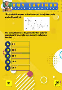 k u y l a t i h a n 3. Grafik hubungan a terhadap t dapat ditunjukkan pada grafik di bawah ini. Jika bandul bermassa 40 gram diikatkan pada tali sepanjang 40 cm, maka gaya pemulih maksimum bernilai ... 5 N 10 N 15 N 20 N 25 N 31