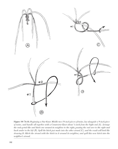 Figure 10-7A–D. Beginning a Star Knot. Middle two 18-inch pieces of twine, lay alongside a 9-inch piece