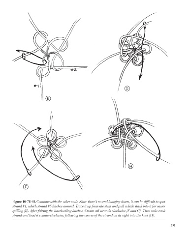 spilling (E). After fairing the interlocking hitches, Crown all strands clockwise (F and G). Then take each