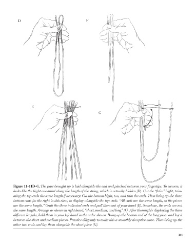 Figure 11-11D–G. The part brought up is laid alongside the end and pinched between your fingertips. To viewers, it