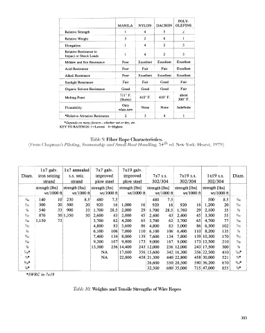 Table 9. Fiber Rope Characteristics. th (From Chapman’s Piloting, Seamanship and Small Boat Handling, 54 ed. New York: Hearst, 1979) Table 10. Weights and Tensile Strengths of Wire Ropes 383