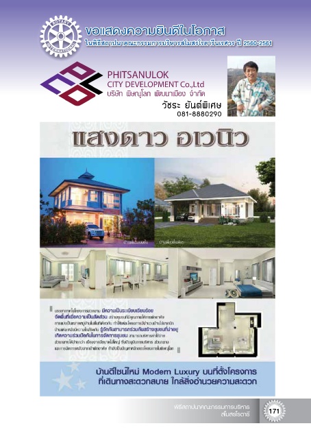 ขอแสดงความยินดีในโอกาส ในพิธีสถาปนาคณะกรรมการบริหารสโมสรโรตารีนเรศวร ปี 2560-2561 PHITSANULOK CITY DEVELOPMENT Co.,Ltd ºรÔÉÑ· ¾ÔɳØโลก ¾Ñ²นาเม×ͧ ¨ÓกÑด วัชระ ยันต์พิเศษ 081-8880290 พิธีสถาปนาคณะกรรมการบริหาร 171 สโมสรโรตารี