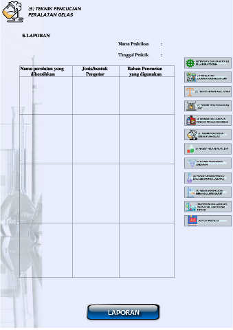 6. LAPORAN Nama Praktikan : Tanggal Praktik : Nama peralatan yang Jenis/bentuk Bahan Pencucian dibersihkan Pengotor yang digunakan