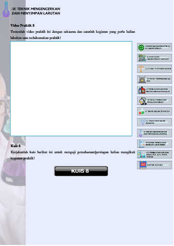 Video Praktik 8 Tontonlah video praktik ini dengan seksama dan catatlah kegiatan yang perlu kalian lakukan saat melaksanakan praktik! Kuis 8 Kerjakanlah kuis berikut ini untuk menguji pemahaman/persiapan kalian mengikuti kegiatan praktik!