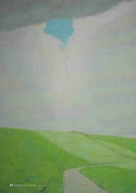 kunstschilder voorstelt. Overal schildersmateriaal, in in een wolkenpartij heeft hij een stukje blauwe lucht