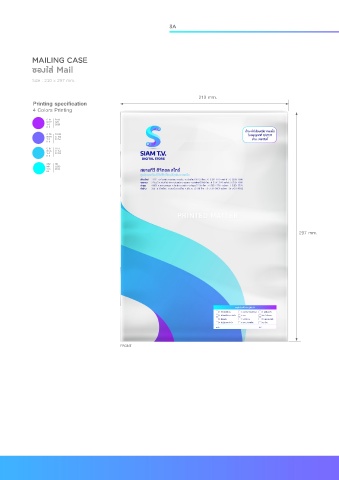 3A MAILING CASE ซองใส Mail Size : 210 x 297 mm. 210 mm. Printing specification 4 Colors Printing C 61 R153 M 77 G51 Y 0 B255 K 0 C 70 R 102 M 64 G 102 Y 0 B 255 K 0 C 67 R 51 M 35 G 153 Y 0 B 255 K 0 C52 R0 M0 G255 Y13 B255 K0 297 mm. FRONT