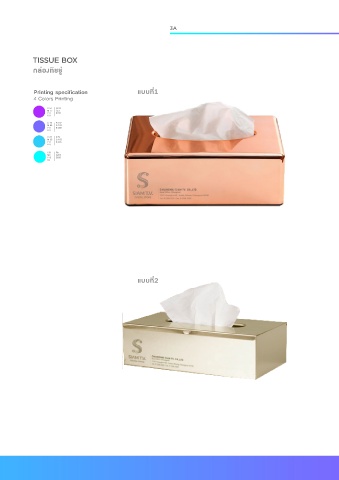 3A TISSUE BOX กลองทิชชู Printing specification แบบที่1 4 Colors Printing C 61 R153 M 77 G51 Y 0 B255 K 0 C 70 R 102 M 64 G 102 Y 0 B 255 K 0 C 67 R 51 M 35 G 153 Y 0 B 255 K 0 C52 R0 M0 G255 Y13 B255 K0 แบบที่2