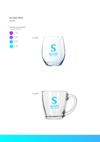 GLASS/MUG แกวนํ้า Printing specification 4 Colors Printing C 61 R153 M 77 G51 Y 0 B255 K 0 C 70 R 102 M 64 G 102 Y 0 B 255 แบบที่1 K 0 C 67 R 51 M 35 G 153 Y 0 B 255 K 0 C52 R0 M0 G255 Y13 B255 K0 แบบที่2