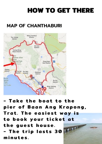 HOW TO GET THERE - T a k e t h e b o a t t o t h e p i e r o f B a a n A n g K r a p o n g , T r a t . T h e e a s i e s t w a y i s t o b o o k y o u r t i c k e t a t t h e g u e s t h o u s e . - T h e t r i p l a s t s 3 0 m i n u t e s .
