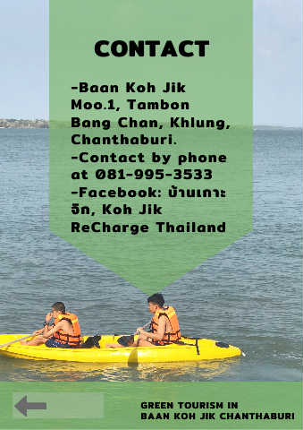 CONTACT -Baan Koh Jik Moo.1, Tambon Bang Chan, Khlung, Chanthaburi. -Contact by phone at 081-995-3533 -Facebook: บ้านเกาะ จิก, Koh Jik ReCharge Thailand GREEN TOURISM IN BAAN KOH JIK CHANTHABURI