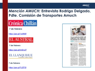 Mención AMUCH: Entrevista Rodrigo Delgado, Pdte. Comisión de Transportes Amuch 7 de Febrero https://goo.gl/1sd4bM 7 de Febrero https://goo.gl/tm6mzP 7 de Febrero https://goo.gl/FUZFSf