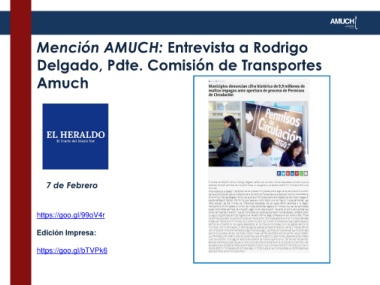 Mención AMUCH: Entrevista a Rodrigo Delgado, Pdte. Comisión de Transportes Amuch 7 de Febrero https://goo.gl/99oV4r Edición Impresa: https://goo.gl/bTVPk6