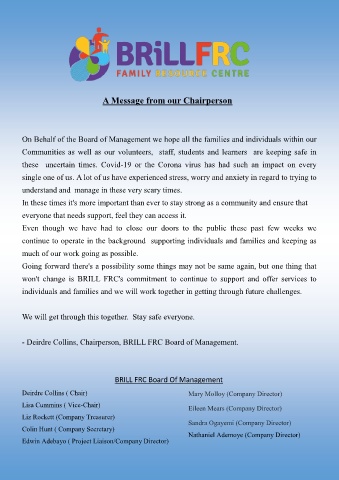- Deirdre Collins, Chairperson, BRILL FRC Board of Management.
