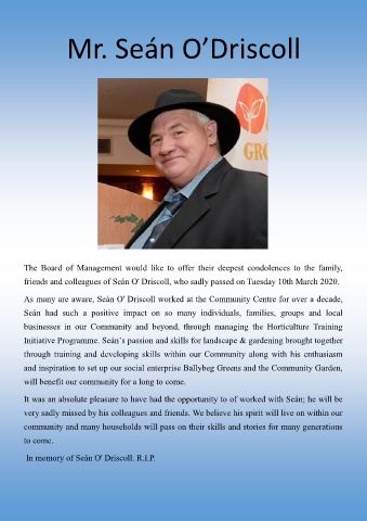 As many are aware, Seán O' Driscoll worked at the Community Centre for over a decade,