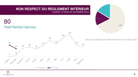 NON RESPECT DU RÈGLEMENT INTÉRIEUR 16% (DURANT LE MOIS DE NOVEMBRE 2019) 80 16% Total Renfort Service 68% 216 188 162 NRRI COLLABORATEUR NRRI EMPLOYES VN NRRI GUEST 127 115 110 115 96 99 80 85 78 16 0 FY18-19 FY19-20 8