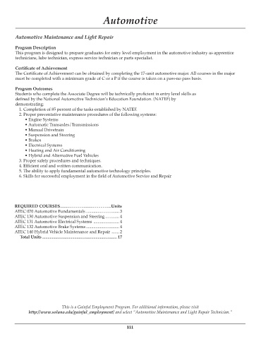 The Certificate of Achievement can be obtained by completing the 17-unit automotive major. All courses in the major