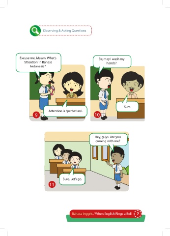 Observing & Asking Questions Excuse me, Ma’am. What’s Sir, may I wash my ‘attention’ in Bahasa hands? Indonesia? Sure. Attention is /perhatian/. 9 10 Hey, guys. Are you coming with me? Sure. Let’s go. 11 Bahasa Inggris / When English Rings a Bell 7