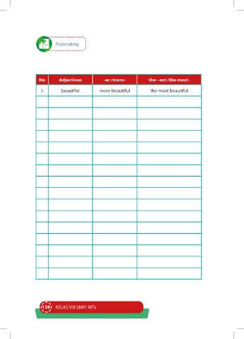 Associating No Adjectives -er /more- the –est /the most- 1. beautiful more beautiful the most beautiful 138 KELAS VIII SMP/ MTs
