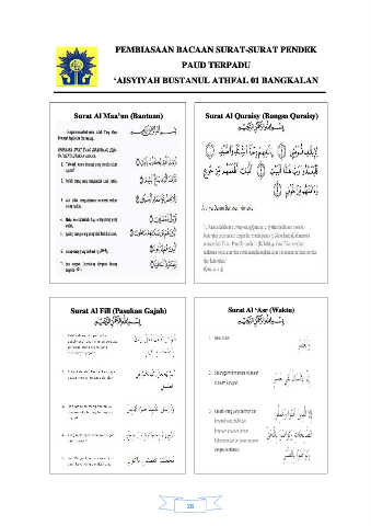 PEMBIASAAN BACAAN SURAT-SURAT PENDEK PAUD TERPADU „AISYIYAH BUSTANUL ATHFAL 01 BANGKALAN Surat Al Maa‟un (Bantuan) Surat Al Quraisy (Bangsa Quraisy) Surat Al Fill (Pasukan Gajah) Surat Al „Asr (Waktu) 28
