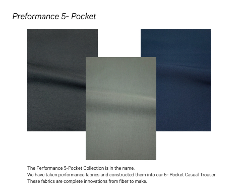 Preformance 5- Pocket The Performance 5-Pocket Collection is in the name. We have taken performance fabrics and constructed them into our 5- Pocket Casual Trouser. These fabrics are complete innovations from fiber to make.