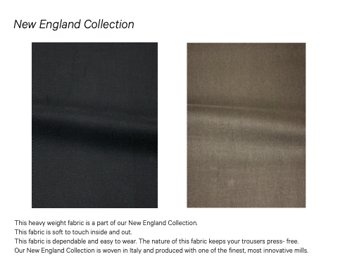This fabric is dependable and easy to wear. The nature of this fabric keeps your trousers press- free. Our New England Collection is woven in Italy and produced with one of the finest, most innovative mills.