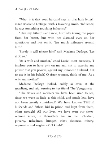 asked Madame Defarge, with a lowering smile. ‘Influence;