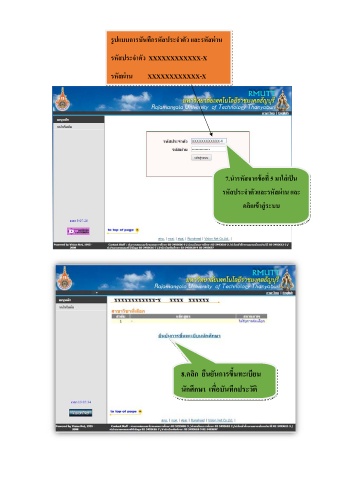 รูปแบบการบันทึกรหัสประจําตัว และรหัสผ่าน รหัสประจําตัว XXXXXXXXXXXX-X รหัสผ่าน XXXXXXXXXXXX-X 7.นํารหัสจากข้อที่ 5 มาใส่เป็น รหัสประจําตัวและรหัสผ่าน และ คลิกเข้าสู่ระบบ 8.คลิก ยืนยันการขึ้นทะเบียน นักศึกษา เพื่อบันทึกประวัติ
