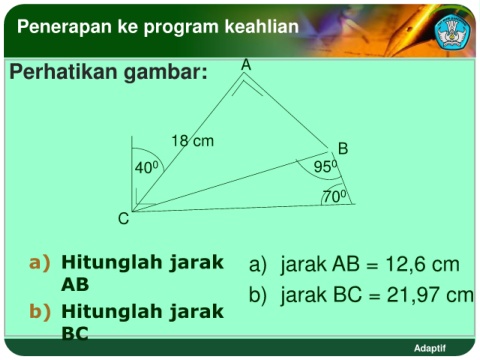 Penerapan ke program keahlian Perhatikan gambar: A 18 cm B 0 40 95 0 70 0 C a) Hitunglah jarak a) jarak AB = 12,6 cm AB b) jarak BC = 21,97 cm b) Hitunglah jarak BC Adaptif