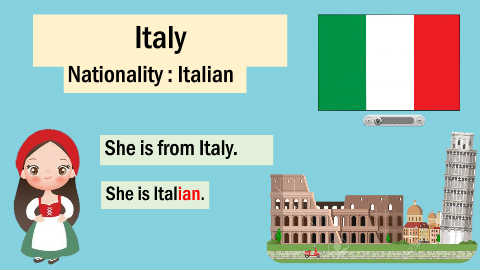 Italy Nationality : Italian She is from Italy. She is Italian.